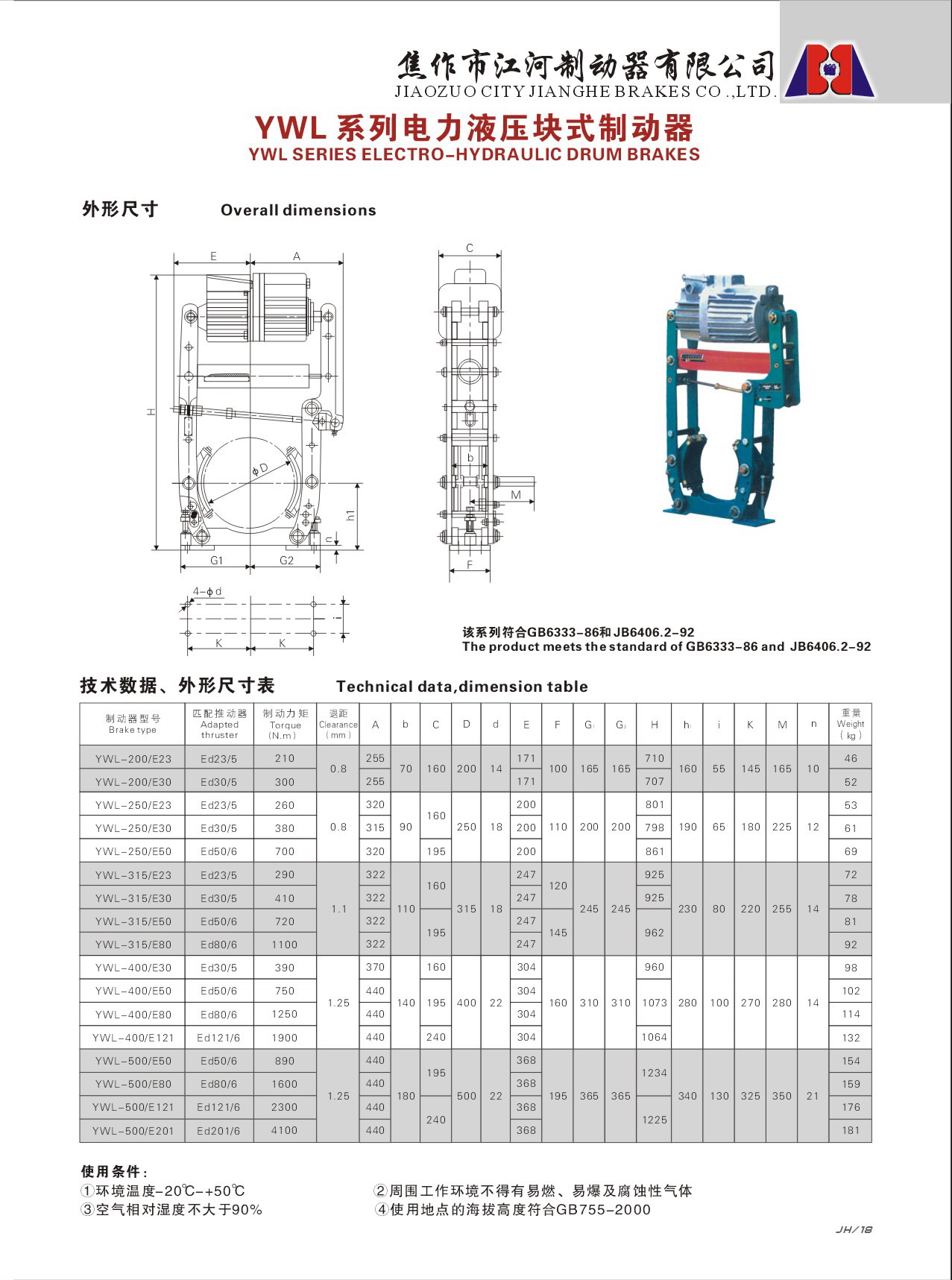 制動器安裝尺寸和制動力矩參數:GB6333-86標準,技術要求符合JB/T6406-2006標準。